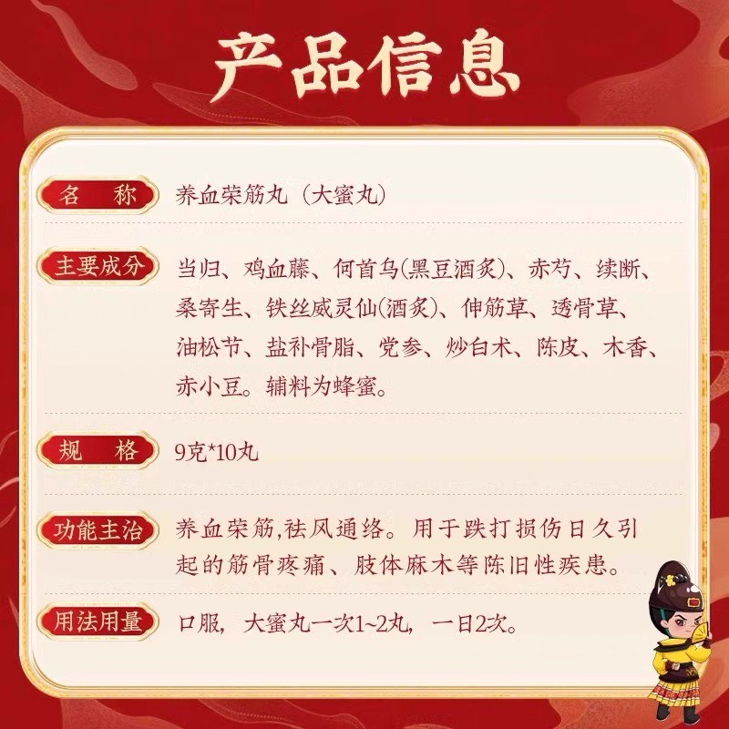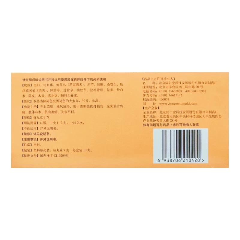 ☘Thành phần: Đương quy, Kê huyết đằng, Hà thủ ô (chích rượu đậu đen), Xích thược, Tục đoạn, Tang ký sinh, Uy linh tiên (chích rượu), Thân cân thảo, Thấu cốt thảo, Tùng tiết, Bổ cốt chỉ, Đảng sâm, Bạch truật, Trần bì, Mộc hương, Xích tiểu đậu, hương liệu khác.
